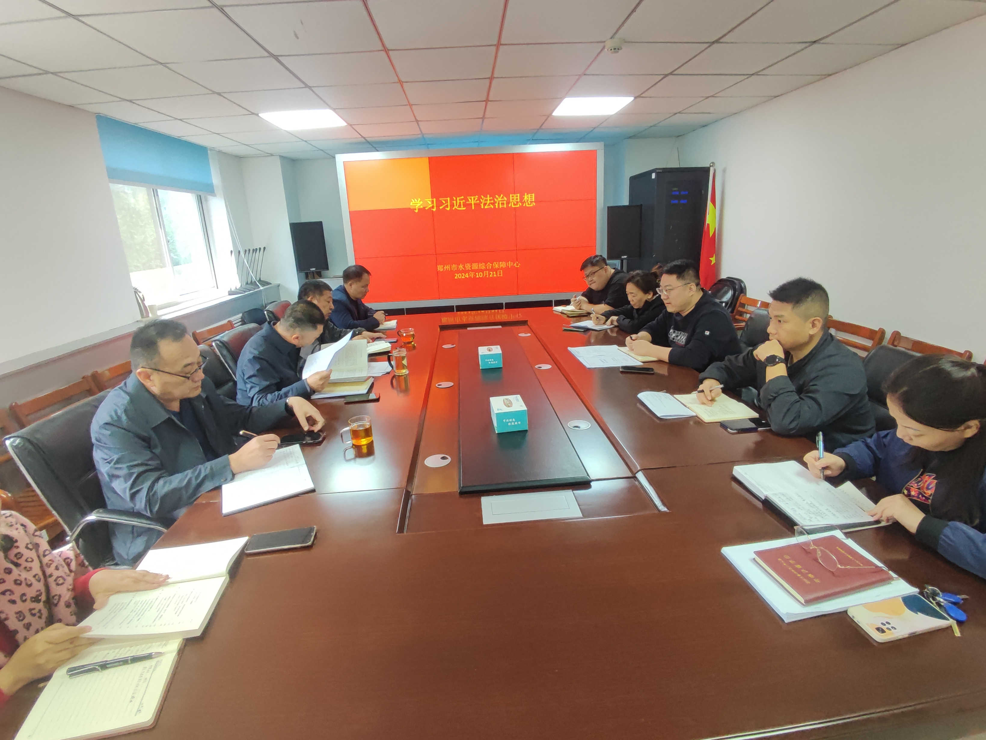 为全面贯彻党的二十届三中全会精神,切实推动学习贯彻习近平法治思想走深走实,10月21日,郑州市水资源综合保障中心召开习近平法治思想专题学习会,中心全体党员参加了此次会议。